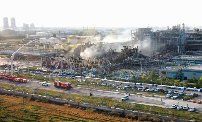 Hiện trường vụ nổ nhà máy hóa chất ở tỉnh Sơn Đông,ngày 27/5. Ảnh: Xinhua