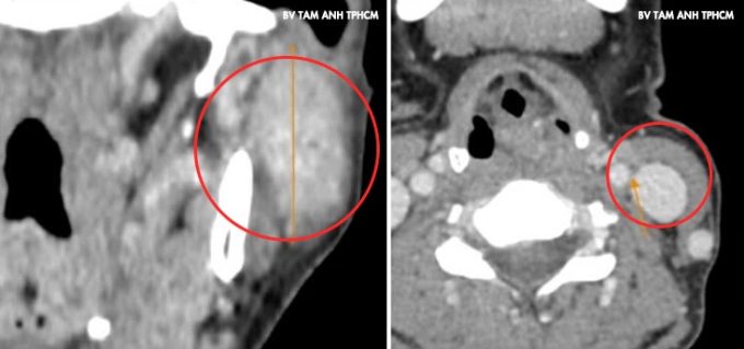 U xuất hiện ở góc hàm mang tai trái của chị Dương một năm trước,nhỏ và không đau,không liệt mặt,khác với đặc điểm chung của loại u này là thường phát triển rất nhanh gây đau và liệt dây thần kinh mặt. Gần đây,u sưng hơn khiến mặt mất cân đối,chị đến Phòng khám Đa khoa Tâm Anh Quận 7 kiểm tra. Kết quả chụp CT và siêu âm ghi nhận khối u dài hơn 4 cm chiếm gần hết mô tuyến mang tai trái,phát triển vào trong xâm lấn dây thần kinh 7 và tĩnh mạch sau hàm. Cạnh trước khối u có hạch gần 1 cm và hai hạch hơn 1 cm vùng cổ. Kết quả sinh thiết chọc hút tế bào kim nhỏ là u tuyến mang tai hóa bọc,chưa xác định ung thư.