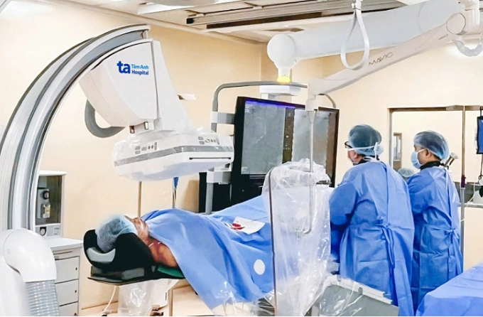 Bác sĩ can thiệp lấy huyết khối ở não cho ông Huỳnh bằng hệ thống chụp mạch DSA. Ảnh: Bệnh viện Đa khoa Tâm Anh