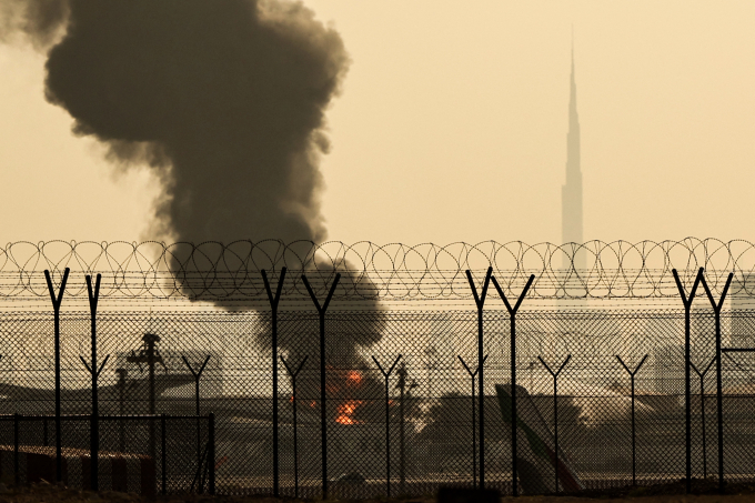 Khói bốc lên từ đám cháy gần sân bay quốc tế Dubai,Các tiểu vương quốc Arab Thống nhất ngày 16/3. Ảnh: AFP