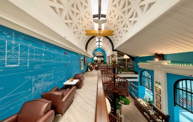 Không gian được thiết kế bởi kiến trúc sư Bill Bensley,lấy cảm hứng "học viện hàng không" những năm 1920. Không gian tái hiện thời kỳ đầu của ngành hàng không qua cấu trúc tầng lửng,trần vòm cao cùng các chi tiết như mô hình máy bay cánh quạt,bản vẽ kỹ thuật và tranh chân dung phi công.