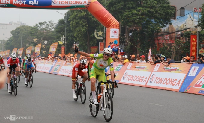 Sergei Kulikov của An Giang mừng chiến thắng chặng một tại giải xe đạp toàn quốc HTV 2025,trưa 3/4 tại Việt Trì,Phú Thọ. Ảnh: Đức Đồng