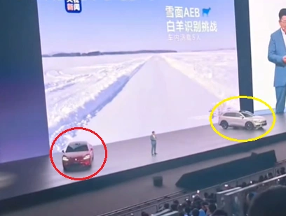 Shangjie Z7 (khoảng đỏ) vẫn đứng trên sân khấu khi mẫu Aito M6 (khoanh vàng) đang được giới thiệu. Ảnh: Weibo