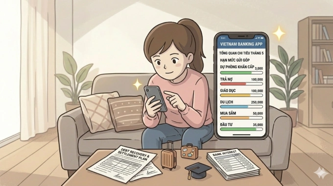 Các món khác: Bảo hiểm,du lịch,học tập hay kế hoạch khác,tôi tạo tiết kiệm gửi góp trên app ngân hàng,tiền có thể được trừ theo ngày hoặc tuần tùy mục tiêu. Việc gửi góp tiết kiệm giúp tôi chủ động khoản cần thanh toán mà trừ hàng ngày sẽ không làm hao hụt chi phí sinh hoạt của gia đình. Nên ghi các khoản chính cần chi cho cả gia đình mỗi tháng và chia các mục cần thiết bao gồm cả việc dự phòng tích sản như món cần "chi" một cách kỷ luật.